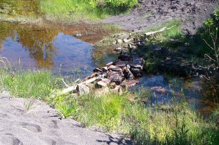 | Day 2 - The first day at the Sands was spent exploring and setting up the infrastructure. This is the little dam that we built on the mine stream. You can see the water intake and the black PVC pipe leading down to the Sands. | |
