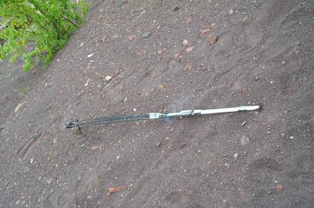 | Day 5 - The Smoky Rocket after landing. The Sonalert is to the left, the white PVC tube was filled with oil and the engine was in the middle. | |