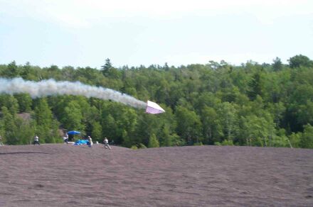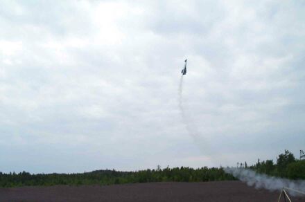 | Day 5 - The Smoky Rocket does its thing. This time the nozzle opened up fully and the rocket left quite a trail. Another feature tested on this rocket was using a Sonalert to locate the rocket after landing. This worked like a charm even though the rocket had no recovery system at all. | |