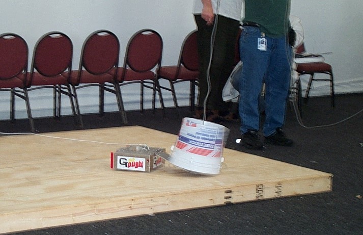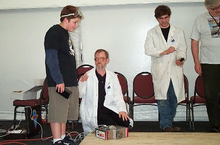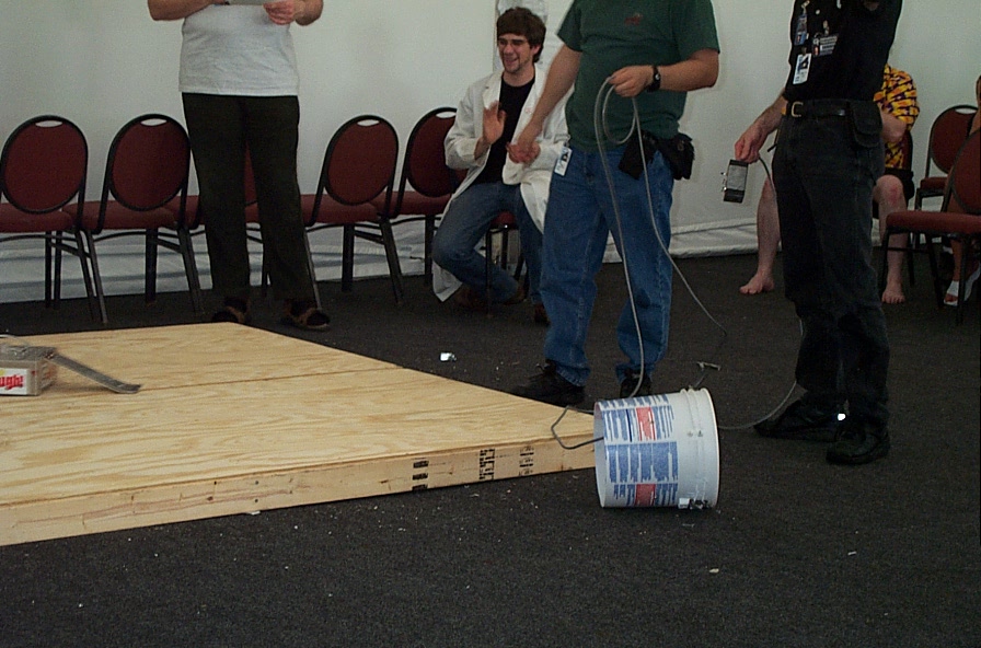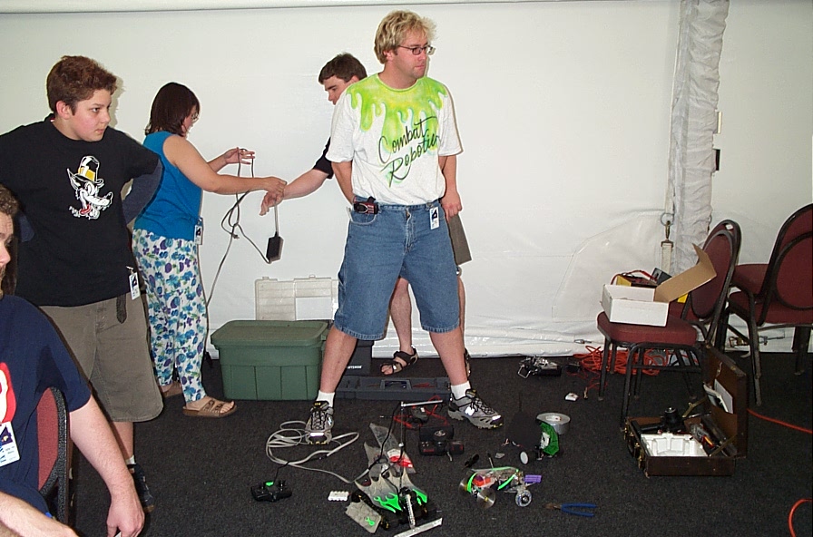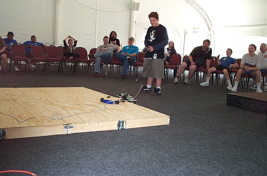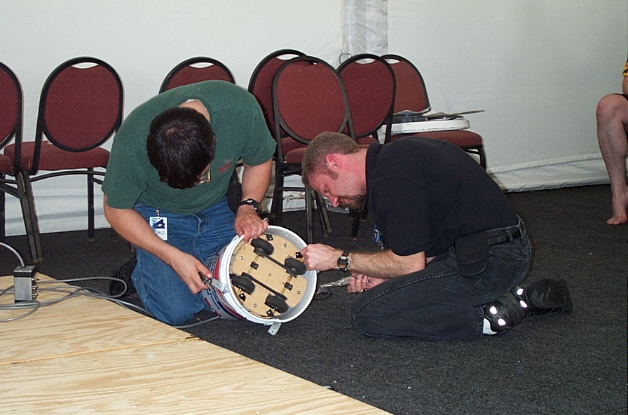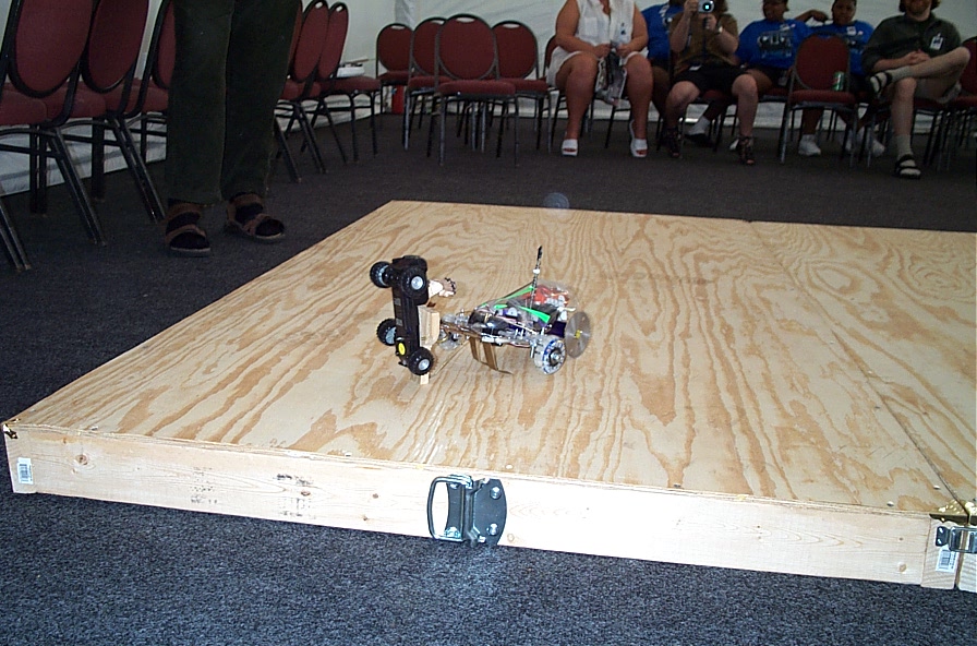 | Then the battle begins. Greg's bot is virtually identical to last year's. | The battle is joined. The problem with this flipper was too much weight toward the front of the bot. |