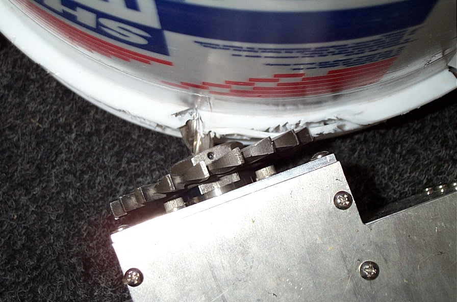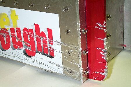 | This is how they got bent. Drywall was spinning at twice the speed he had at CapriCon and really chewed into the newly added protective aluminum "L" channel - as well as the rest of Get Tough. | |