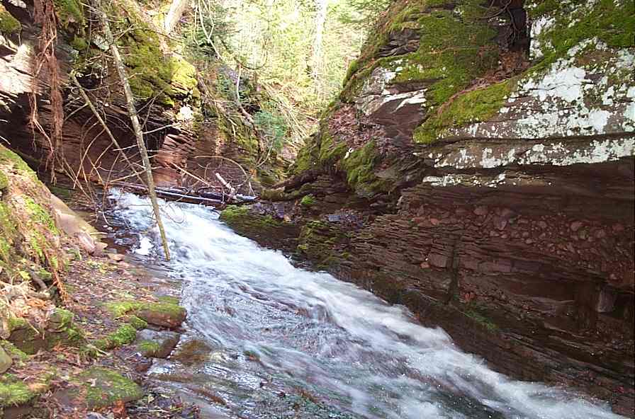 | The Creek becomes very interesting. Notice the tilted strata of sandstone. | |