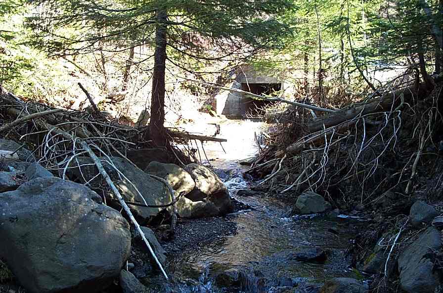 | Owl Creek as it exits from under the road. | A section typical of the stretch between the road and the dam. There were LOTS of trees in the stream here. |
