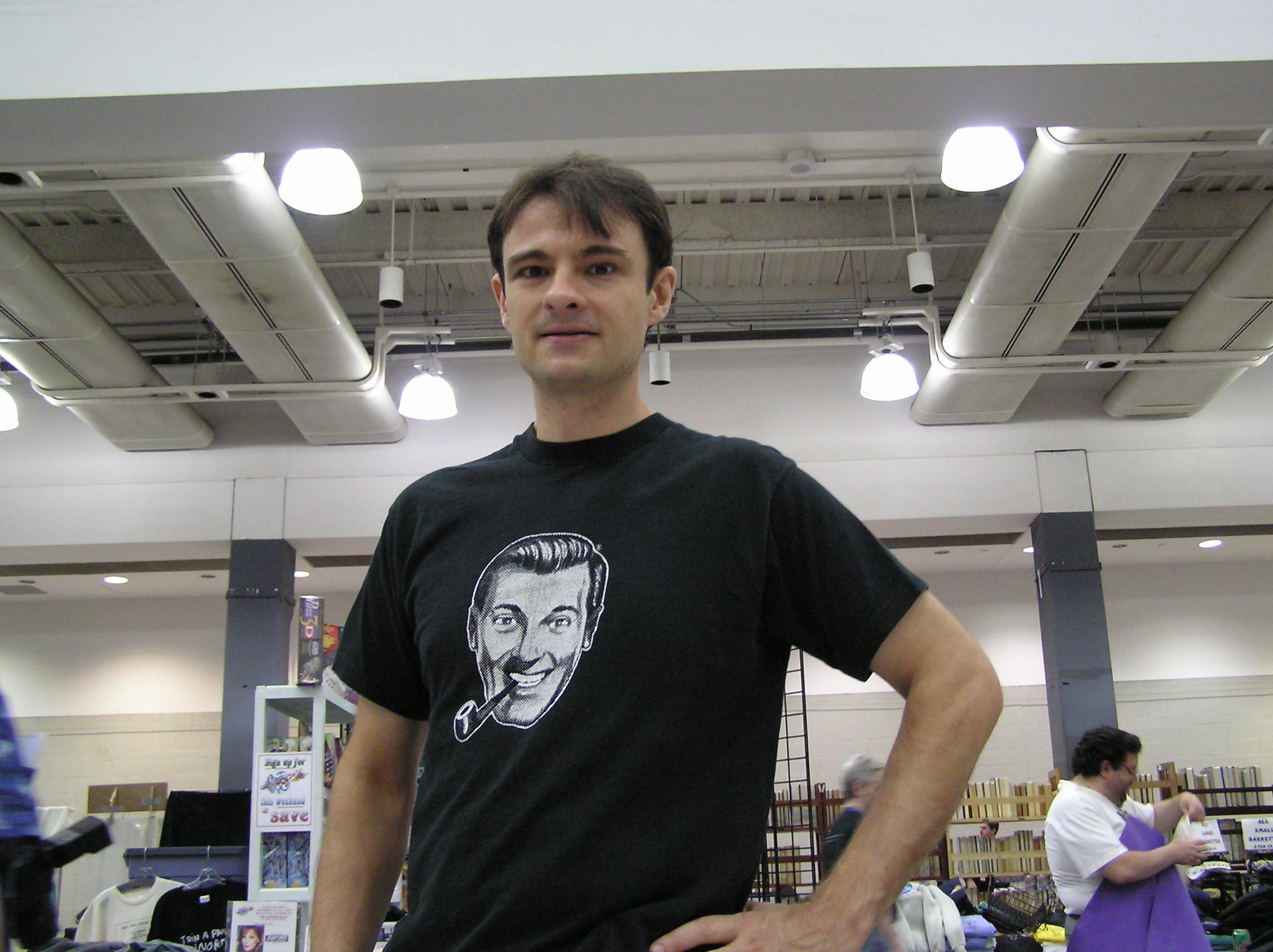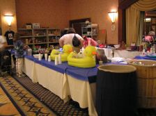 The dealer's room was ok and though we were in the back of the room (as usual) there actually was an entrance to the hotel not more then 40' away - very convenient. We got a number of people to help us out since Amy had a heavy on line class load. Here Howard demonstrating the Zen of ray gun salesmanship. |