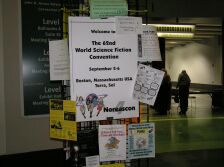 ...And at last we make it to the con. Noreascon 4 was a fun convention but very strange in one respect. The first two days I don't remember seeing a single person under 30! Once the weekend hit some demographic balance was restored but I do get the feeling that a whole generation went to Dragon Con instead. |