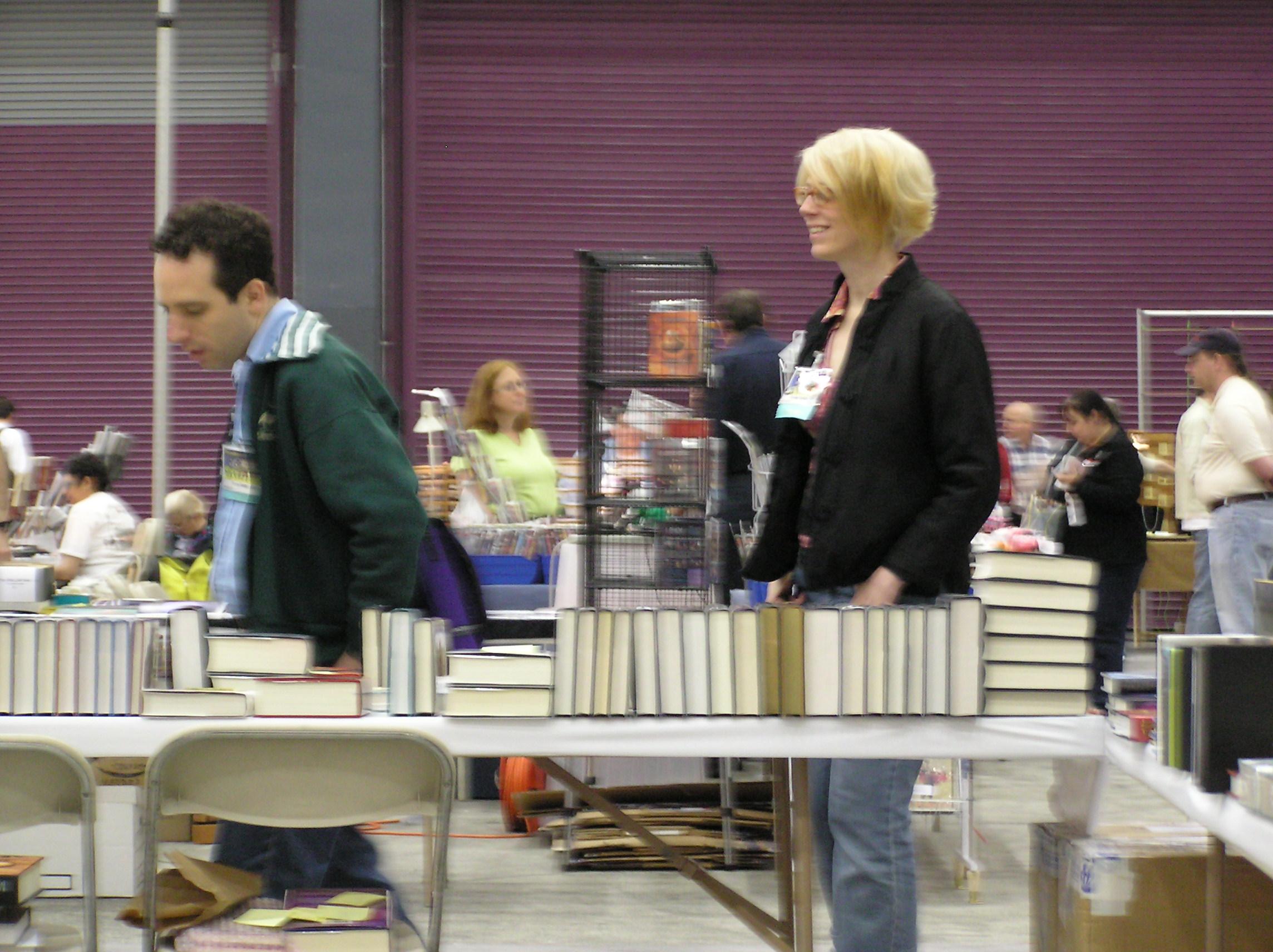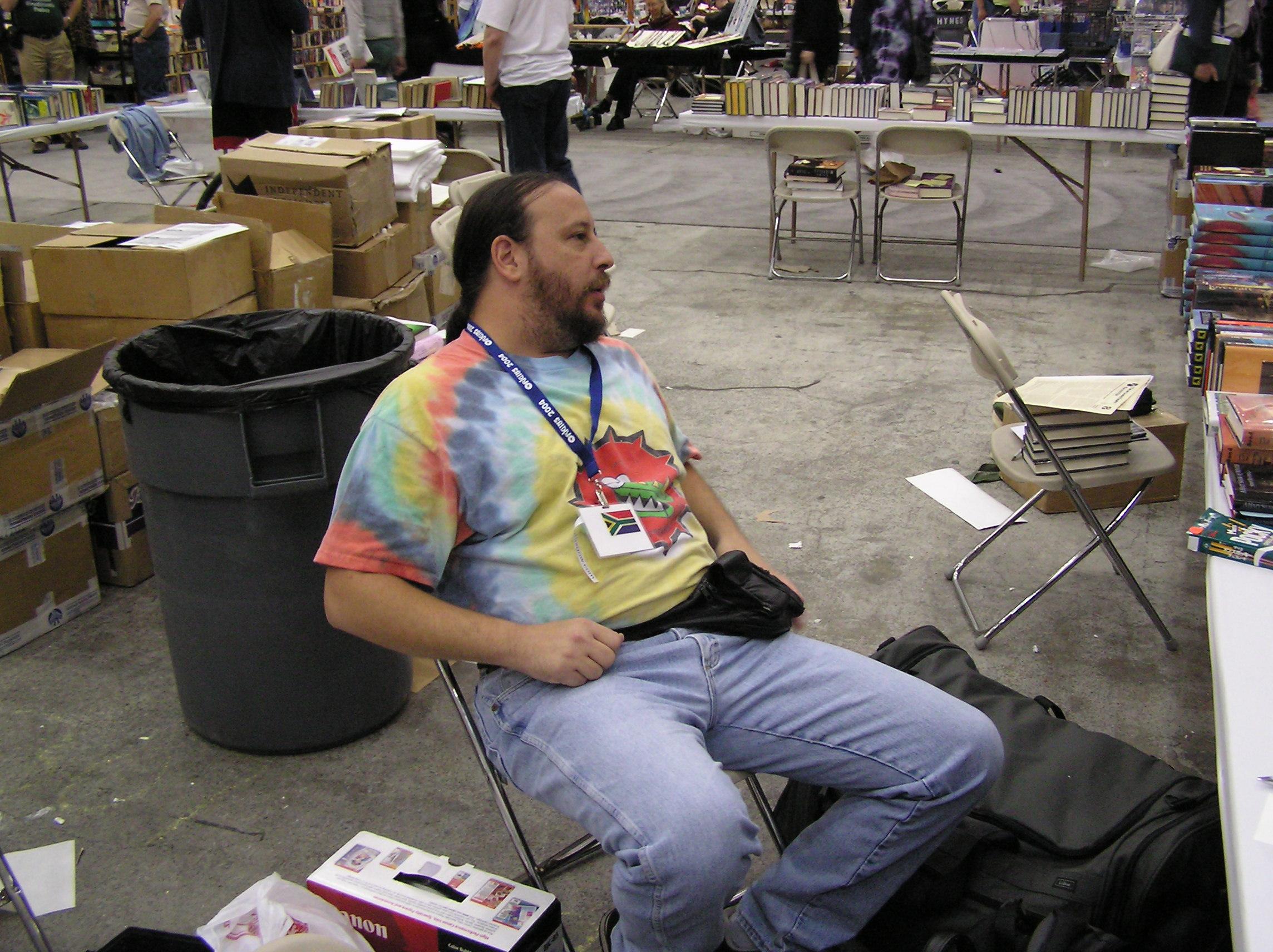 One of the bad part about being a dealer is that you go from being bored silly when nobody comes by for hours to trying to conduct multiple sales at once while trying to talk to old friends you haven't seen for years. One of the pluses at this con was that they had WiFi in the dealers room we could check on our cats back home via the Ishercam. |