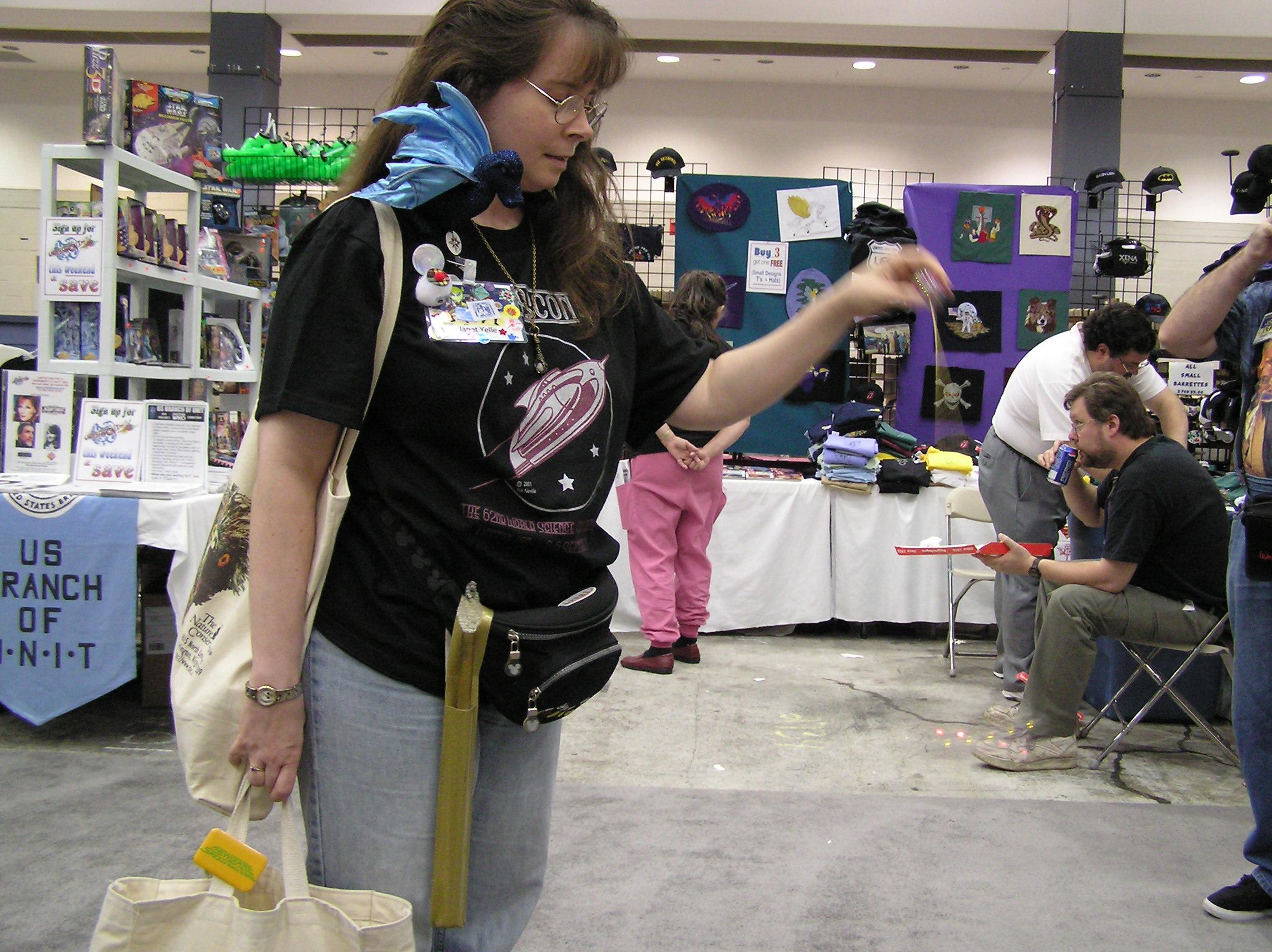 As usual a number of interesting people came by. Here one is demonstrating a blinking led yoyo-like device. This fan is also carrying one of the Isher Magic Wands(tm) at her hip. |