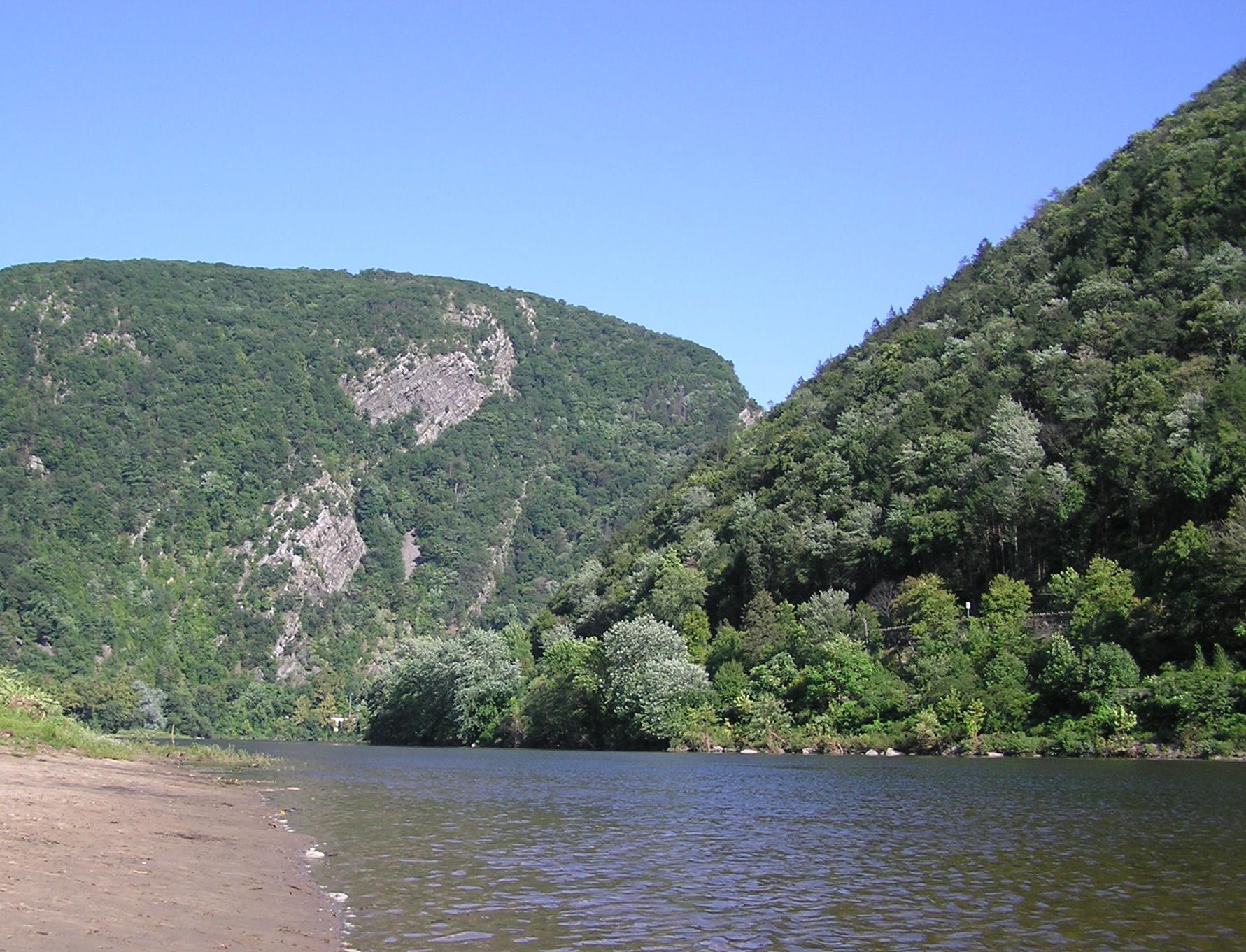 On our way to Boston we decided to take a "scenic" route by driving through the Delaware Gap National Recreation Area. We exited I80 immediately after crossing into New Jersey and I do mean immediately since the road north actually goes under the bridge crossing the Delaware river. This shot looks due Southeast along the river. |